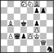 4: 1.Lf5+ Ke8 2.Le4 mit der Absicht 3.L:c6# reicht nicht, da Weiß keine Antwort auf 2. f5,6 hat. Sofort 1.Lg4+? Ke8 2.L:f3 scheitert an 2. T:c3! mit Fesselung des Lf3. Daher muss in einem Vorplan zunächst diese Parade ausgeschaltet werden. 1.Lf5+! Ke8 2.Te4+ Kd8 3.Ld4. Gegen die symmetrische Drohung Lf6 hilft nur die sD, was den Block auf c3 erzwingt: 3. b:c3. Nach 4.Lf6+ De? 5.L:e7+ Ke8 6.Lc5+ (Rundlauf des wL!) 6. Kd8 7.Td4+ Ke8 8.Ld7+! Kd8 hat Weiß seine Ausgangskonstellation so verbessert, dass der Hauptplan durchschlägt: 9.Lg4+ Ke8 10.L:f3 f5 (10. T:c3??) 11.Lh5#. Ein ganz besonderer Geniestreich gelang Kricheli mit 5. Der Hauptplan 1.Tag2 nebst 2.Tg1+ 3.T6g2# scheitert an e:f5! Daher muss der sBe6 weggelenkt werden. 1.Lg4! Kg1 2.Lh3+ Kh1 3.Lg2+ Kh2. Schnell erledigt ist 3. Kg1? 4.Ld5,c6+ Kf1 5.Lc4,b5+. 4.Lf1+ Kh1 5.Le2 Kh2 6.Sd5! Die massive Drohung des wS, über f4 einzugreifen, zwingt den sBe6 zum Handeln. 6. e:d5. Schneller geht es nach 6. e5 7.Lf1+ Kh1 8.Lg2+ Kh2 9.Le4+ Kh3 10.Lf5+ nebst 12.Th2# bzw. 8. Kg1 9.Le4+ 10.Se3+ 11.Tg1#. 7.Lf1 Kh1 8.Lg2+ Kg1 9.Lh3+ Kh1 10.Lg4 Kgl 11.Lf5+ Kh1 12.Tag2 13.Tg1+. Fünf kurze L-Schritte von f5 bis e2 und dann das Ganze auch noch wieder zurück!! Das erinnert nicht nur an Loschinskis berühmtes h#5, sondern konnte auch kaum anderswo als in dessen Gedenkturnier so passend publiziert worden! Man mag sich fragen, was es in dem Turnier noch besseres gegeben haben kann. Jedenfalls gaben später alle FIDE-Album-Richter maximale Punktzahl einer der raren 12-Ender im Album-Revier! Der kurze Hauptplan: 1.Lc2+ Ka2 2.L:b3? scheitert in 6 an der Deckung durch die sD. Um sie wegzulenken, muss der wL weit ausholen, die ganze schwarze Mannschaft in Schach halten und besetzt dabei auch alle übrigen freien Felder der Diagonale b1-f5. Nach 1.Lf5+! Ka2 2.Td2+ Ka1 3.Tb7 versperrt er dem sT den Zugang zu f7 und zwingt Schwarz zu 3. L:f2. Nach 4.Td1+ Ka2 5.Lb1+ Ka1 6.Ld3+ Ka2 7.Td2+ Ka1 8.TbS vereitelt er das Eingreifen der sD auf c3 und lenkt den sL nach 8. Lb6, wo der seinerseits den sSa8 behindert (schwächer ist 8. Tf5? 9.Td1+ Ka2 10.Lb1+ nebst 11.L:f5, 12.Ta5#). Es folgt 9.Td1+ Ka2 10.Lb1+ Ka1 11.Le4+ Ka2 12.Td2+ Ka1 13.Tb4 Dd7. Die erneute Verstellung des Tf4 verhindert jetzt 13. T:c4 und lenkt endlich die sD von b3 weg. 14.Td1+ Ka2 15.Lb1+ Ka116.Lc2+ Ka2/D:d1 17.L:b3/Ta4#.